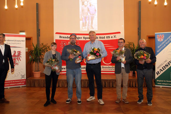 Eigentlich hatte er sich einen Profi-Radsportler zur Feier gewünscht. Daraus wurde zwar nichts, doch der Brandenburgische Radsportverband entsandte mit dem Vizepräsidenten Steffen Blochwitz und der Landestrainerin Stephanie Gaumnitz – sie ist die Chefin von Henry Bertz in seiner Funktion als Landesstützpunktleiter - immerhin zwei Ex-Weltmeister. Die verliehen Henry Bertz die silberne Ehrenmedaille des Radsportverbandes und für den sportlichen Leiter der Sparte Martin Vogel gab es ein Ehrengeschenk. Zuvor hatte der SSB-Vorsitzende Gerd Wartenberg dem Spartenchef bereits die SSB-Ehrennadel an das Jackett geheftet. Die gab es auch für Karsten Schultze und für Jan Greve eine Ehrenurkunde.
