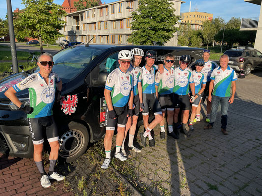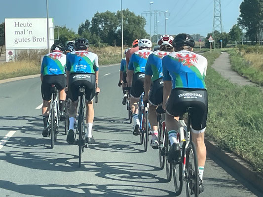 Einige Sportlerinnen und Sportler gingen noch in die Verlängerung und verkürzten ihre Regenerationszeit durch einen Kneipenbesuch. Am nächsten Morgen ging es nach dem Frühstück für 12 Sportlerinnen und Sportler auf den Rückweg. Natürlich mit dem Rad. Die ersten Kilometer waren wellig und der Rhythmus wurde nach dem ersten und einzigen Defekt des Tages langsam gefunden. Nach Schwerin lief es richtig gut und der Wind schob uns mehrmals an, sodass die erste Pause in Perleberg nach 125 km schnell erreicht war. Hier wurden wieder alle kulinarischen Feinheiten verzerrt, die eine Tankstelle so hergibt. Die Streckenplanung veränderten wir leicht, sodass wir bis Havelberg überwiegend Bundes- und Landstraße fuhren. In Havelberg standen wir dann in einem kleinen Stau, welcher aber die Stimmung nicht trübte. Dann ging es bei zügigem Tempo gen Brandenburg und nach dem Absetzen zweier Vereinsmitglieder erreichten wir Brandenburg um kurz nach 17 Uhr. Dank guter Beine und Rückenwind konnten wir die 227 km in 7 Stunden (32.3 km/h) zurücklegen. Es war eine wirkliche tolle Erfahrung, die allen Spaß gemacht hat.