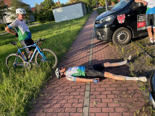 Am nächsten Tag ging es nach einem kräftigen Frühstück und natürlich auf dem Rad wieder in Richtung Heimat. Die Strecke war schon bekannt und die Temperaturen waren mit max. 27 Grad wesentlich angenehmer als am Vortag. Erfreulicherweise auch keine einzige Panne! So entspannt, über eine lange Distanz, wann hatten das die Südler schon einmal? Trotzdem waren alle überglücklich nach knapp 480 km den Heimatort ohne Vorkommnisse wieder erreicht zu haben. Auch wenn die Erschöpfung nicht zu übersehen war (siehe Foto)!