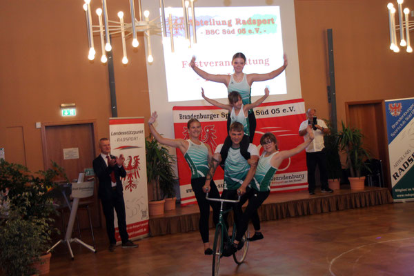 Neben Ulf Wiesener, Thomas Koschek, Monika und Ronny Schmidt, Birgit Bertz, David Müller und Sven Rosenthal wurde auch Stefan Weinreich als Sponsor der Sparte geehrt. Unterbrochen wurde die Auszeichnungsflut erst durch das von der Radeweger Firma Lindner angerichtete Buffet und später noch vom Auftritt der Kunstradfahrer des SV Grün-Weiß Märkisch Buchholz. Während lange Schlangen zeigten, dass das Essen schmeckte, gab es für die Kunstradfahrer für ihre Vorführungen immer wieder lautstarken Beifall.